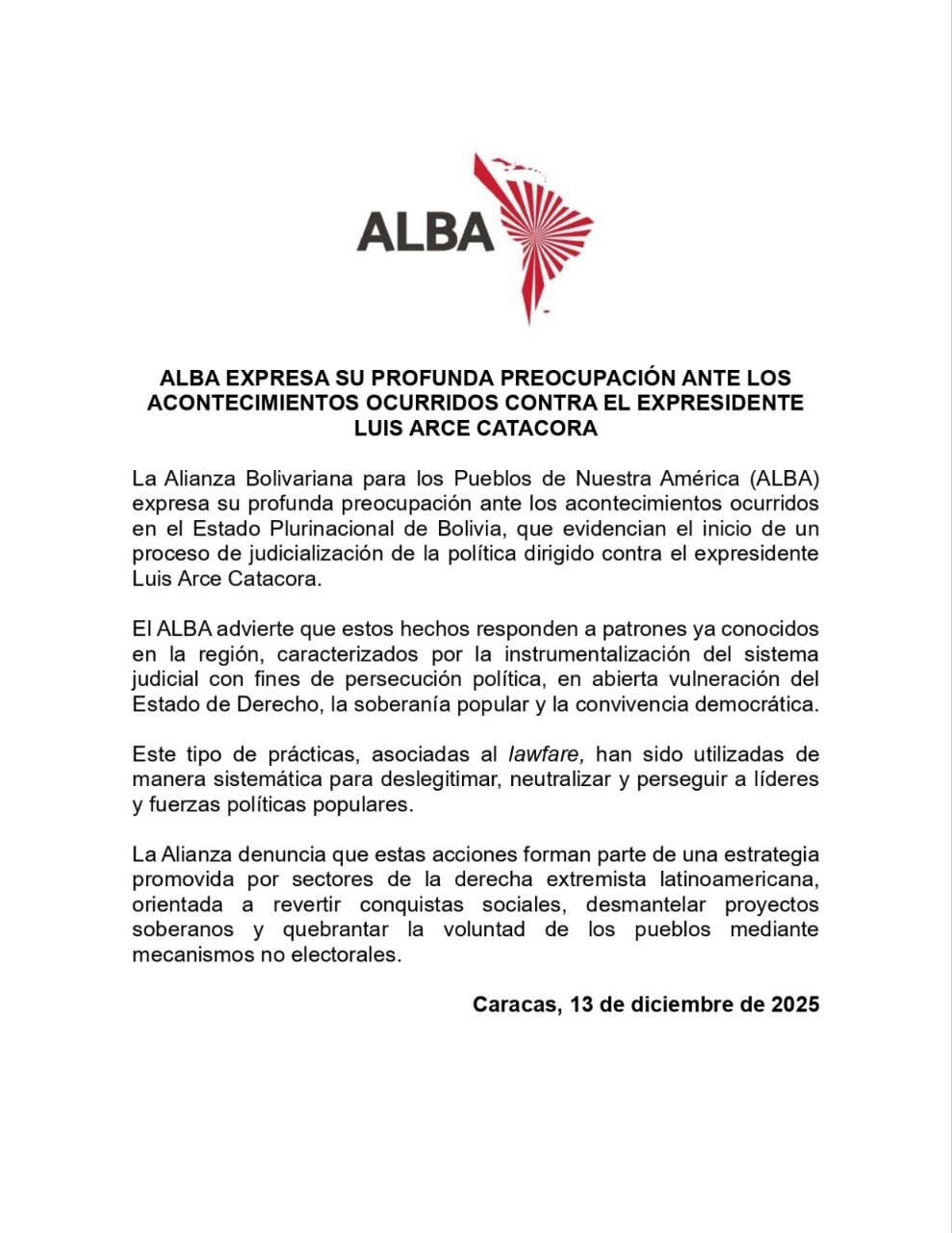 Ciudad MCY.-La Alianza Bolivariana para los Pueblos de Nuestra América- Tratado de Comercio de los Pueblos (ALBA-TCP), denunció la instrumentalización del sistema judicial con fines de persecución política contra el expresidente de Bolivia, Luis Arce, en abierta vulneración del Estado de Derecho, la soberanía popular y la convivencia democrática.