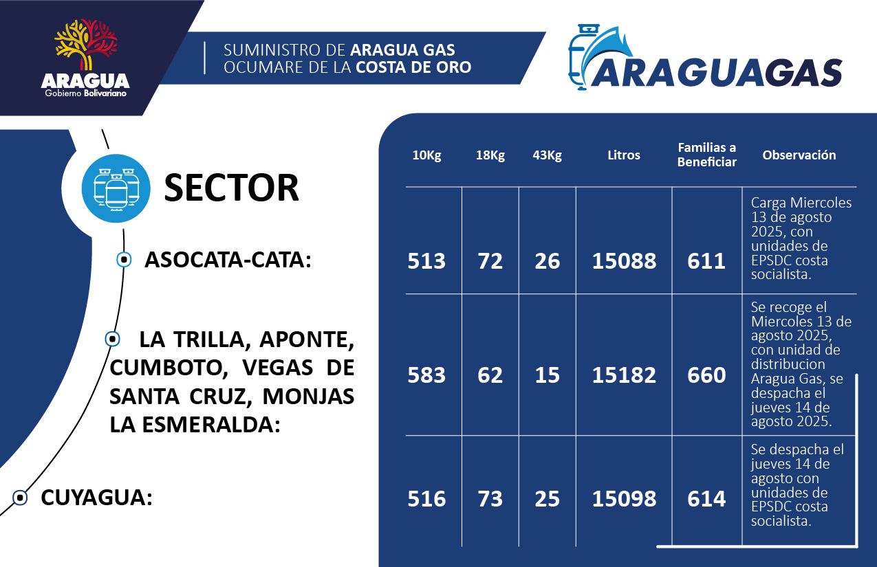 Según información difundida por la empresa estadal Aragua Gas, en los sectores de Asocata y Cata serían distribuidos 15.088 litros de GLP que beneficiarán a 611 familias.