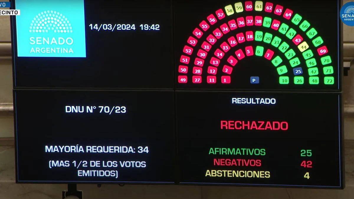 El polémico DNU, con el que el mandatario busca desregular la economía y reducir la intervención del Estado, obtuvo 42 votos en contra, 25 a favor y 4 abstenciones. Así, el paquete de medidas podría perder vigencia en su totalidad si la cámara baja también lo rechaza.