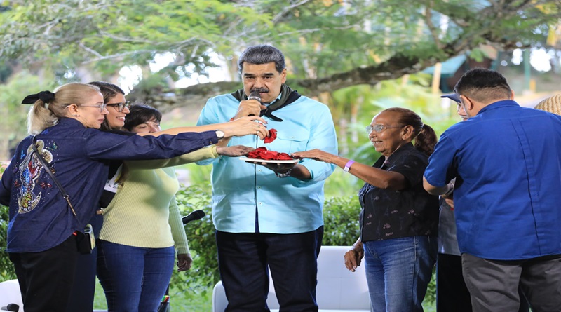 “Vamos a proceder aquí, a bautizar este libro con pétalos de rosa roja; ustedes, muchachas, mujeres, pongan su mano para, en el nombre del padre, del hijo, del Espíritu Santo, de toda la fuerza celestial, material, terrenal de la patria, en nombre de la espiritualidad de Bolívar y de Chávez, bautizamos este libro a 200 años del Decreto de Chuquisaca y decimos: nuestro destino es vencer y nosotros venceremos”, expresó rodeado de pueblo, autoridades y la hija del Comandante Hugo Chávez Frías, Rosinés, en su condición de presidenta de Inparques.
