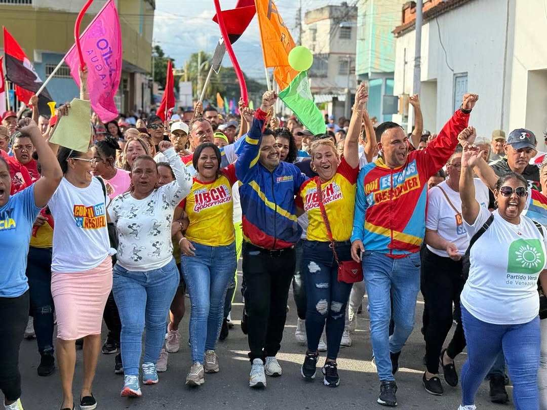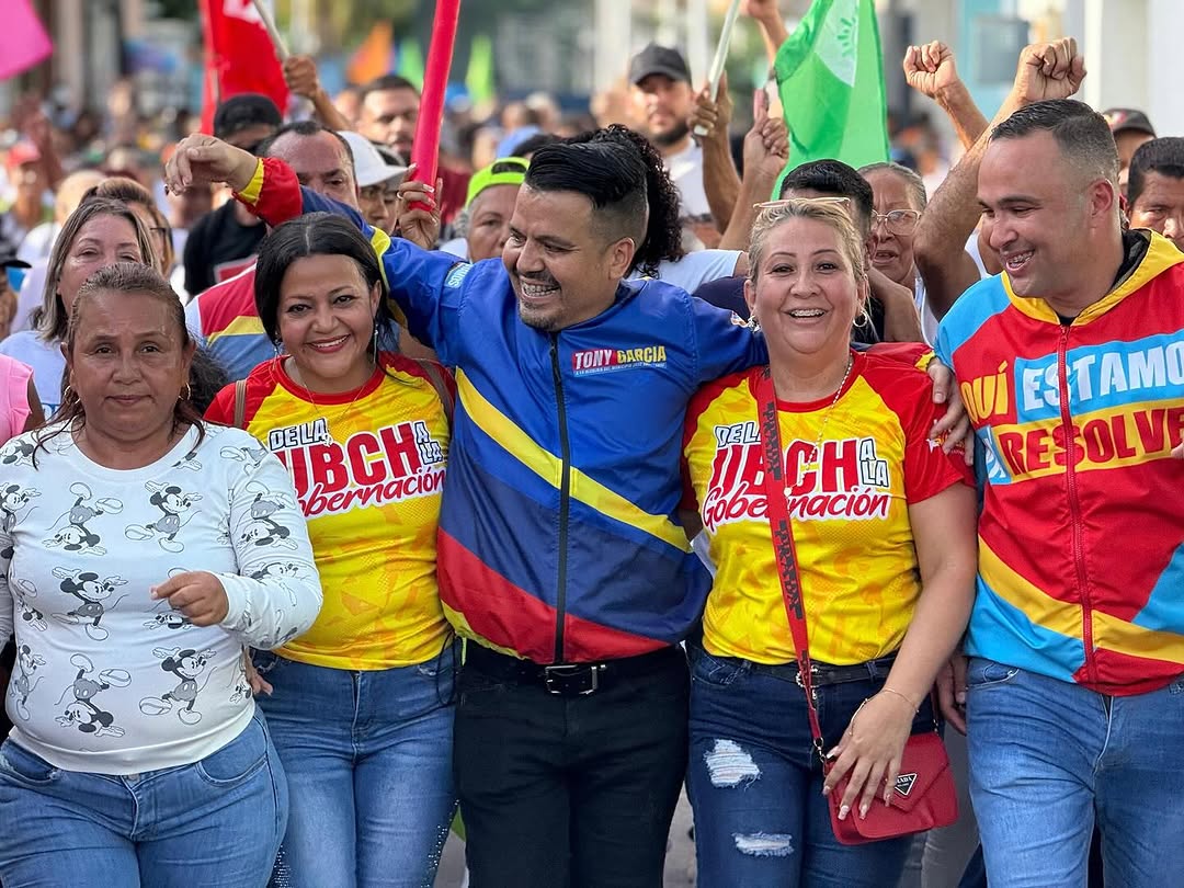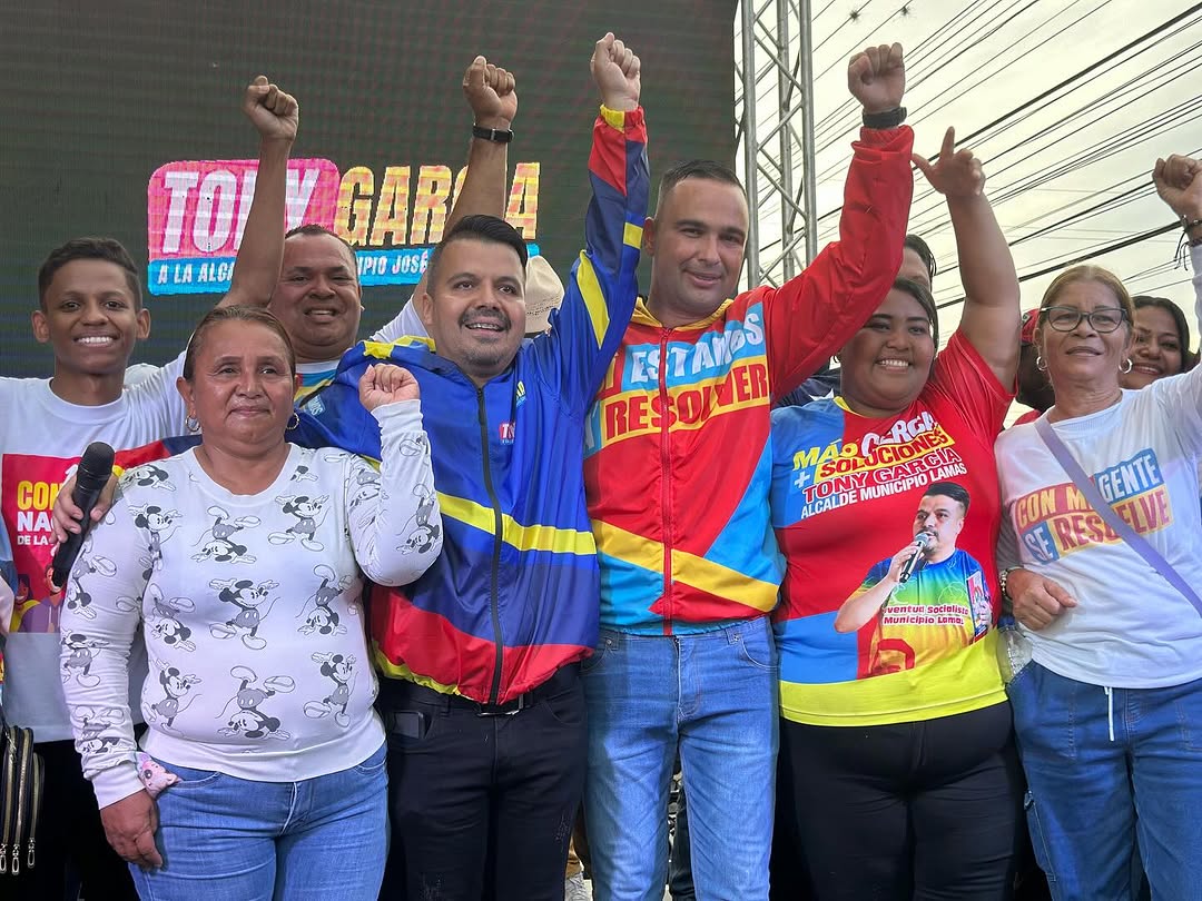 CIUDAD MCY.- Con una imponente muestra de apoyo popular, el candidato por el Gran Polo Patriótico ‘’Simón Bolívar’’ (GPPSB) a la alcaldía del municipio José Ángel Lamas, Tony García, culminó su campaña electoral en una multitudinaria concentración que desbordó las calles de Santa Cruz.