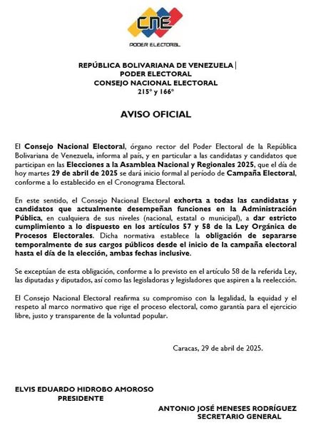 En este sentido, a través de un comunicado, el CNE destacó que dicha normativa establece la obligación de separarse temporalmente de sus cargos públicos desde el inicio de la campaña electoral hasta el día de la elección, ambas fechas inclusive.
