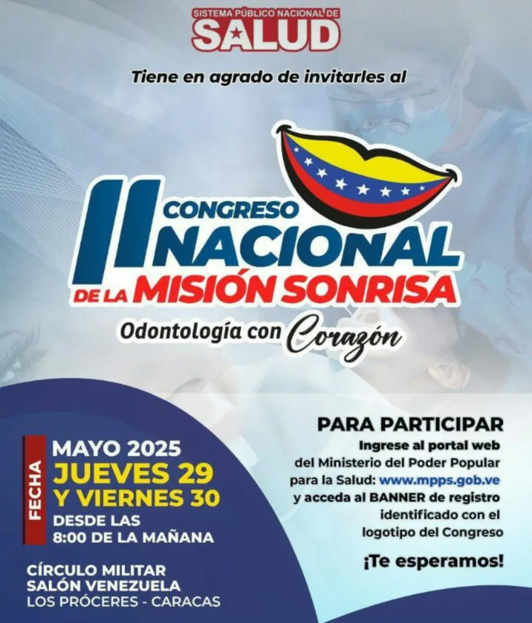 CIUDAD MCY.- El II Congreso Nacional de la Misión Sonrisa Odontología con Corazón se realizará en el país 29 y 30 de mayo, en las instalaciones del Círculo Militar, Caracas, donde se reunirán 1.500 profesionales del gremio odontológico.