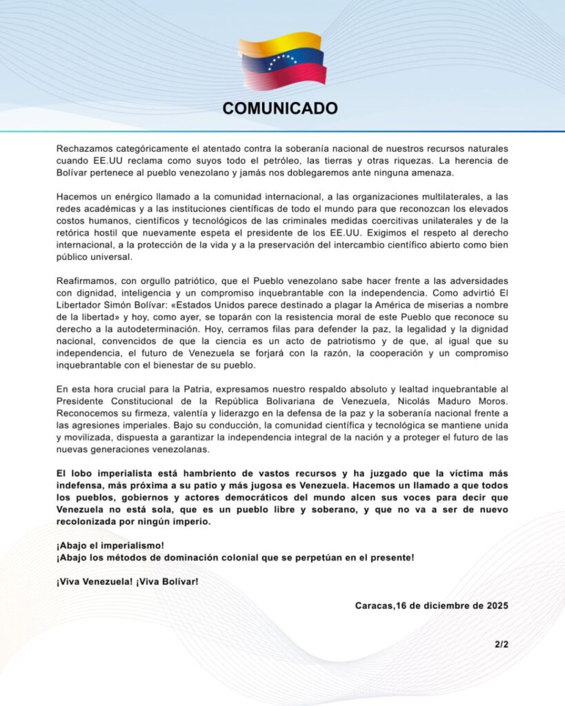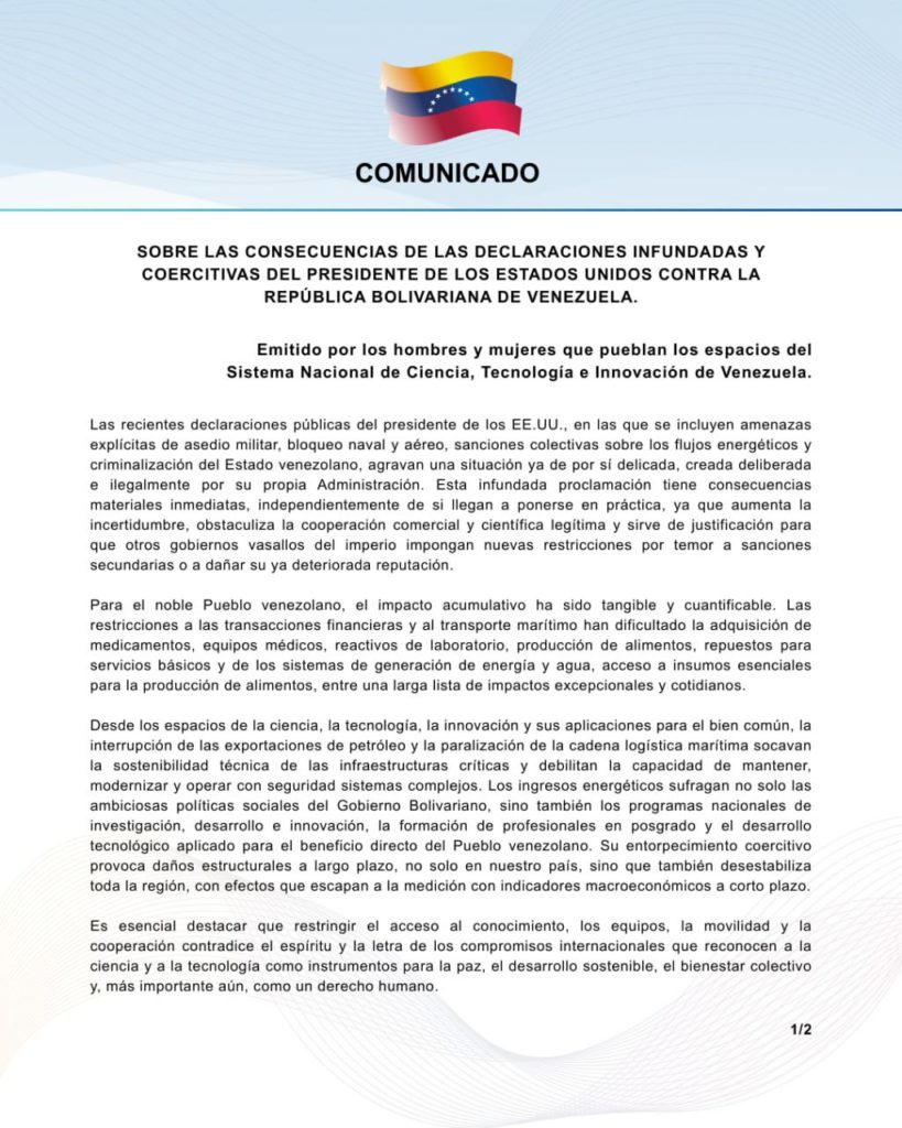 CIUDAD MCY.- La comunidad científica venezolana, por medio de un comunicado, manifestó su firme repudio ante las recientes declaraciones del Gobierno de los Estados Unidos, las cuales contemplan amenazas de asedio militar y bloqueos navales contra la nación.