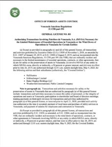 En el documento, citado por la agencia TASS, Washington no se opone a que las empresas Halliburton, Schlumberger, Baker Hughes y Weatherford realicen las transacciones necesarias con el fin de concluir las principales operaciones en Venezuela y cumplir con los contratos y acuerdos que garanticen la seguridad del personal y los activos de dichas compañías.