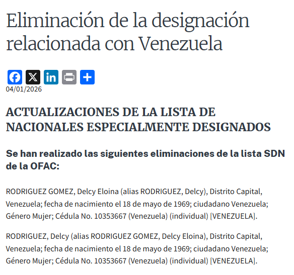 El nombre de la mandataria encargada fue eliminado de la «Lista de Nacionales Especialmente Designados», según una publicación en el sitio web de la Oficina de Control de Activos Extranjeros del Departamento del Tesoro estadounidense.