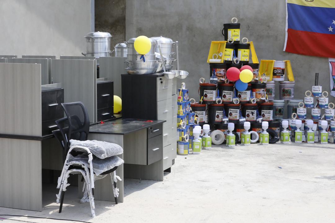 Para continuar la adecuación del espacio, le fue entregada una importante dotación de materiales como pintura, brochas, lavamanos, pizarrones, mobiliario de oficina, entre otros.