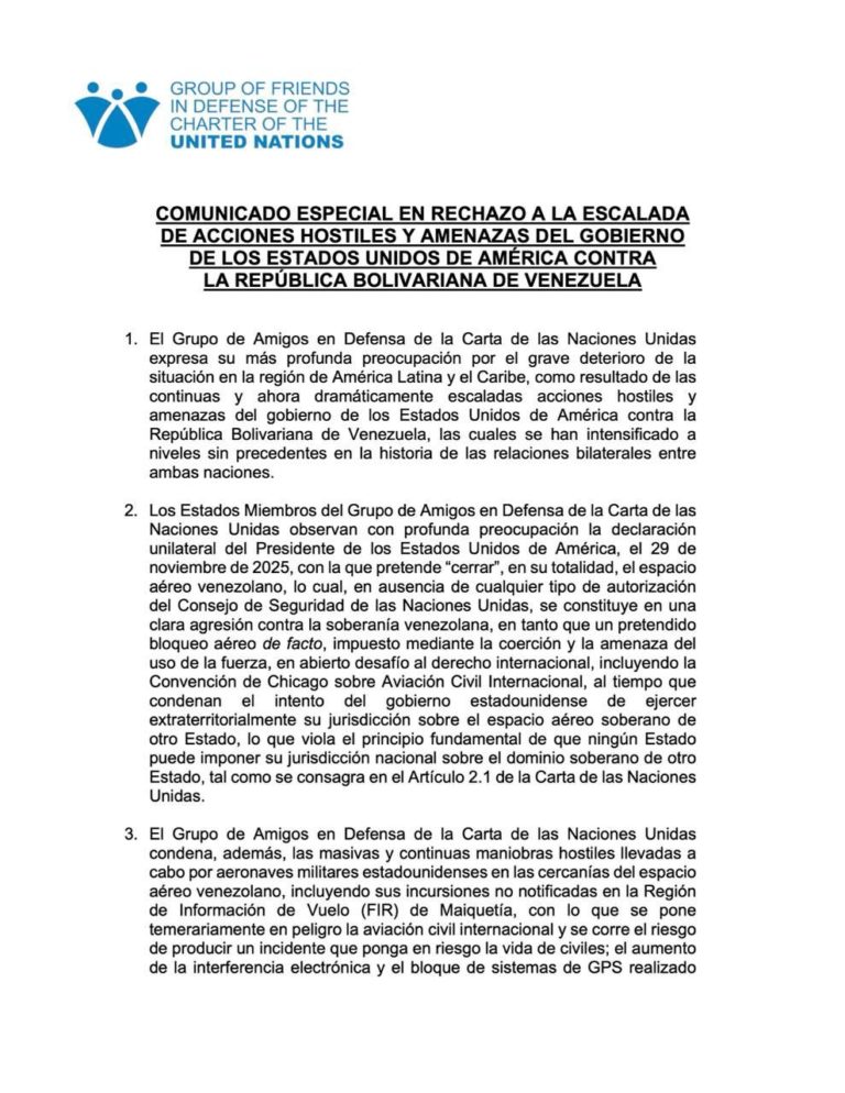 CIUDAD MCY.- El Grupo de Amigos en Defensa de la Carta de las Naciones Unidas (ONU) expresó su profunda preocupación por el grave deterioro de la situación en la región de América Latina y el Caribe, provocado por las continuas escaladas, acciones hostiles y amenazas del Gobierno de los Estados Unidos (EE. UU.) contra la República Bolivariana de Venezuela.