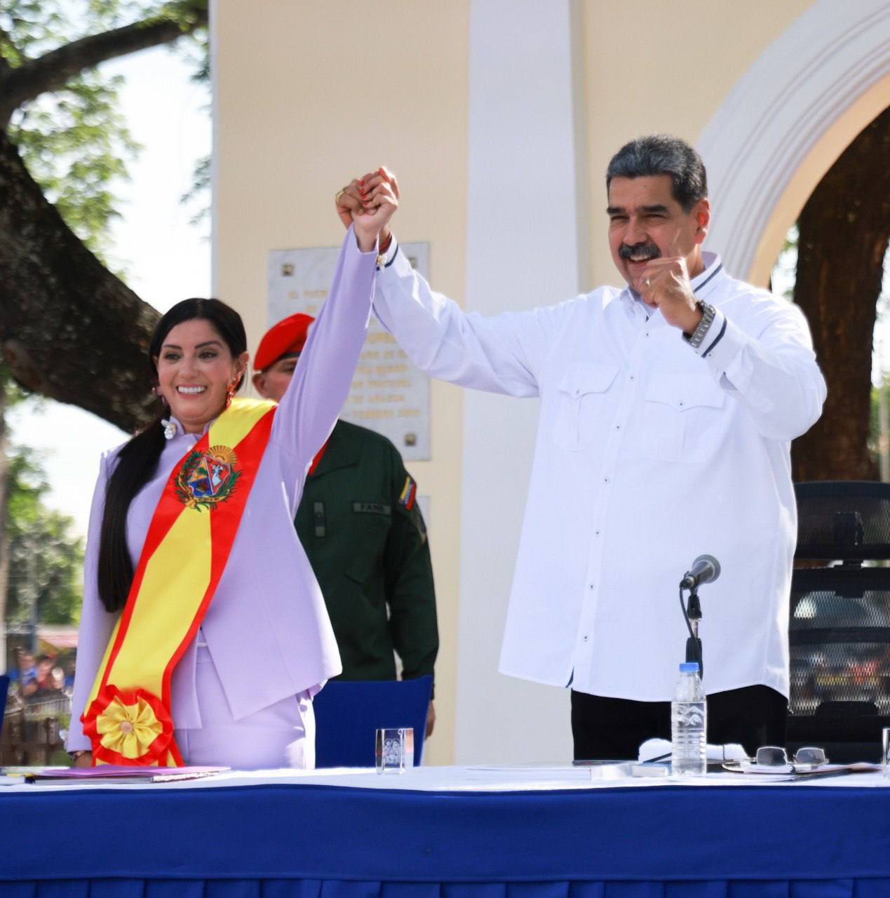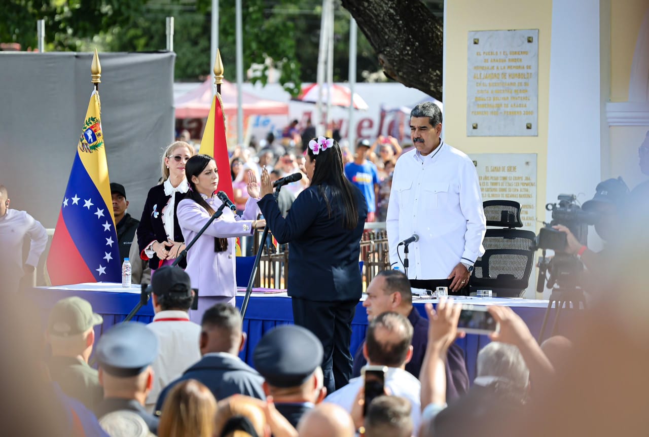 Ciudad MCY.– Joana Sánchez fue juramentada como la nueva gobernadora del estado Aragua en una sesión solemne del Consejo Legislativo del estado bolivariano de Aragua, realizada desde el histórico Samán de Güere, en el municipio Santiago Mariño. El acto de investidura contó con la presencia y el respaldo del presidente de la república, Nicolás Maduro Moros, y de la primera dama, Cilia Flores, quienes acompañaron este importante momento para la entidad.