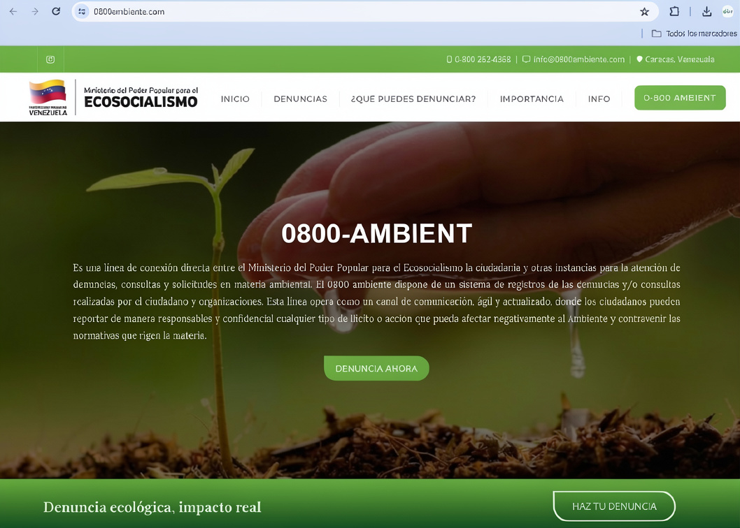CIUDAD MCY .- Con el propósito de crear una vía más por el cual se puedan realizar denuncias relativas al ambiente, el Ministerio del Poder Popular para el Ecosocialismo (Minec), habilitó la página WEB 0800ambiente.com, en la cual la población podrá exponer, mediante un detallado cuestionario, sus inquietudes.