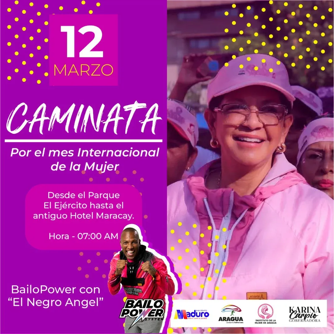 CIUDAD MCY.- Bajo las instrucciones de la máxima autoridad regional, Karina Carpio, el Instituto de la Mujer de Aragua (IMA) organizará para este miércoles 12 de marzo  una Caminata 4K denominada “Todas Somos Heroínas”.