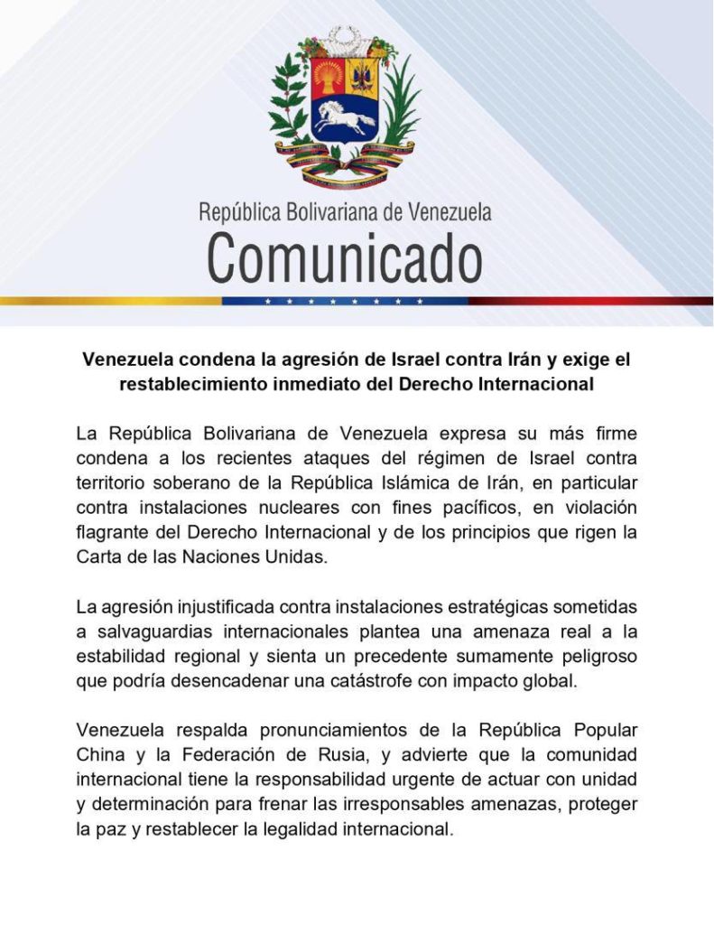 El Gobierno constitucional de la República Bolivariana de Venezuela expresa su más firme condena a la agresión del régimen de Israel contra el territorio soberano de la República Islámica de Irán, en particular contra instalaciones nucleares con fines pacíficos, en violación flagrante del Derecho Internacional y de los principios que rigen la Carta de las Naciones Unidas.
