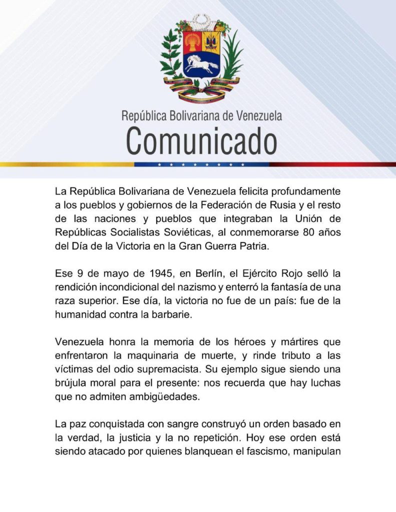 CIUDAD MCY.- Venezuela felicita profundamente a los pueblos y gobiernos de la Federación de Rusia y el resto de las naciones y pueblos que integraban la Unión de Repúblicas Socialistas Soviéticas, al conmemorarse 80 años del Día de la Victoria en la Gran Guerra Patria.