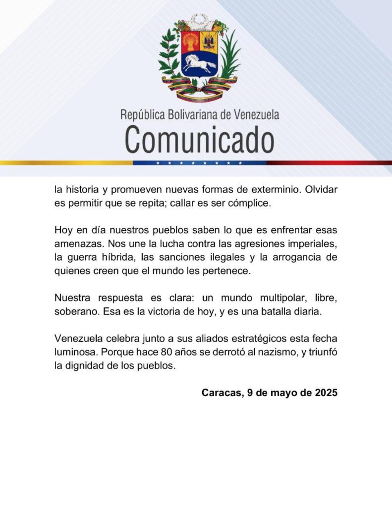 «Ese día, la victoria no fue de un país: fue de la humanidad contra la barbarie. Venezuela honra la memoria de los héroes y mártires que enfrentaron la maquinaria de muerte, y rinde tributo a las víctimas del odio supremacista. Su ejemplo sigue siendo una brújula moral para el presente: nos recuerda que hay luchas que no admiten ambigüedades», manifiesta parte de la misiva.