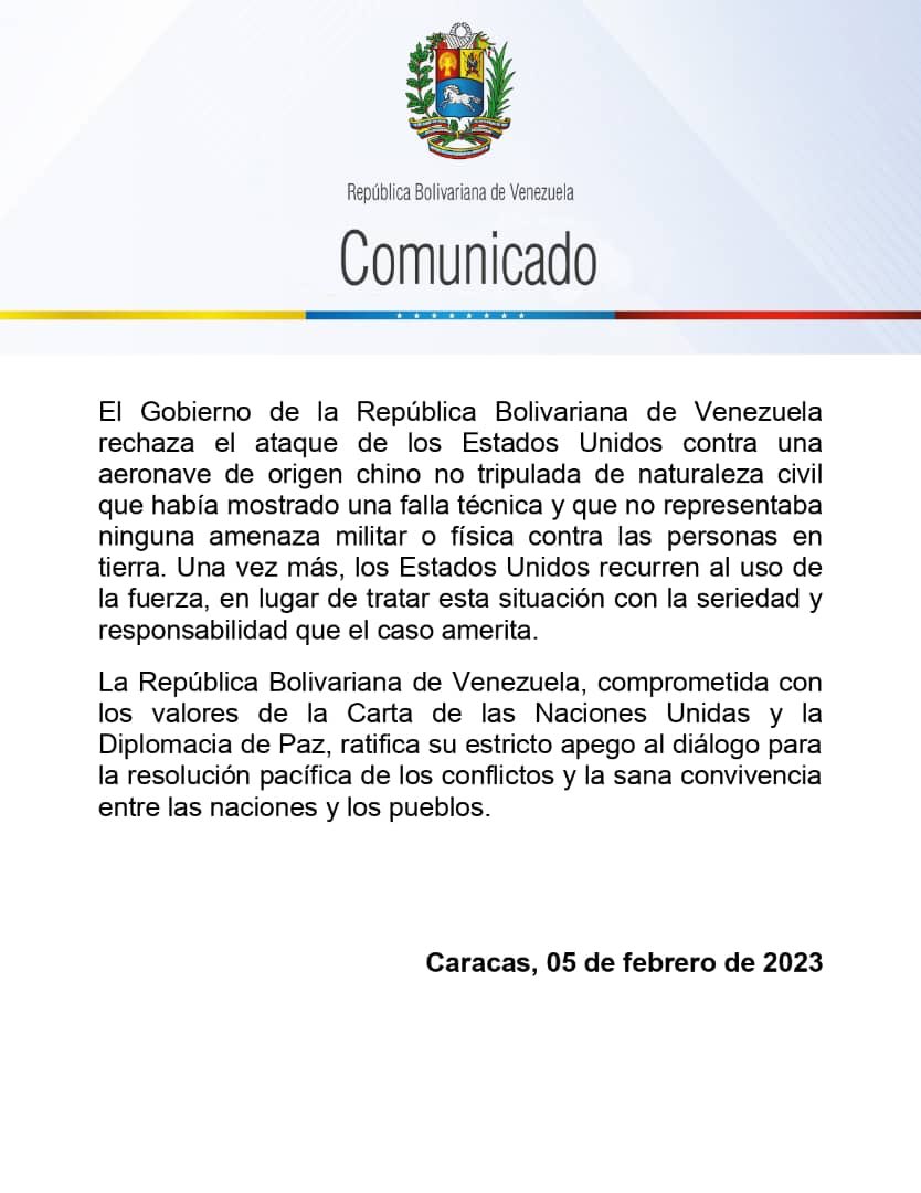 CIUDAD MCY.- El canciller de la República, Yvan Gil, en su cuenta Twitter, difundió un comunicado en rechazo al ataque perpetrado por Estados Unidos contra una aeronave de origen chino no tripulada de naturaleza civil, y hace votos por resolver las controversias de manera responsable y apegada al Derecho Internacional.