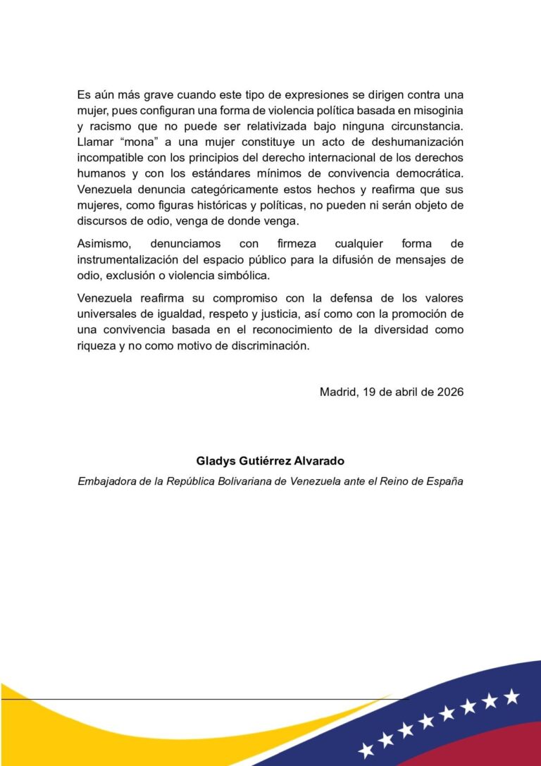 En ese sentido, esta Embajada expresa sus más sinceras disculpas al pueblo de España, que conoce en su propia historia el horror del fascismo y de los crímenes de odio, y a todas aquellas personas que hayan podido sentirse ofendidas por dichas declaraciones. Tales palabras no representan al pueblo venezolano ni a su cultura, caracterizada por el respeto, la solidaridad y la dignidad humana.