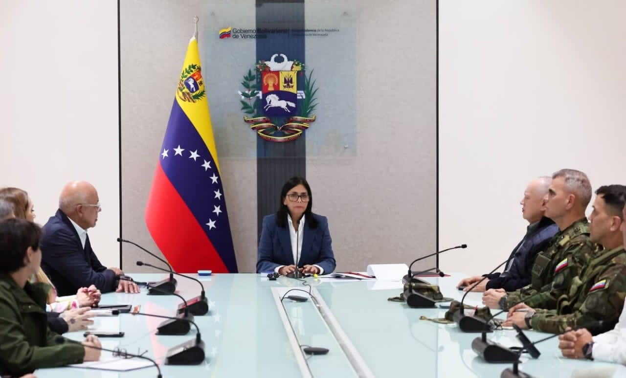 La vicepresidenta encabezó una reunión del Consejo de Defensa de la Nación ante la agresión militar en contra Venezuela, acompañada de altos funcionarios del Gobierno Bolivariano. En este contexto, Rodríguez recordó que el ejecutivo venezolano ya había advertido sobre una agresión en curso bajo «falsas excusas y pretextos», destacando que «las caretas se habían caído».